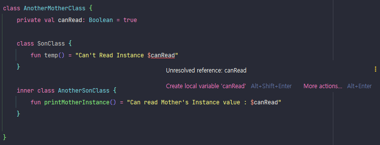 class AnotherMotherClass { private val canRead: Boolean = true class SonClass { fun temp() = "Can't Read Instance $canRead" } inner class AnotherSonClass { fun printMotherInstance() = "Can read Mother's Instance value : $canRead" } }