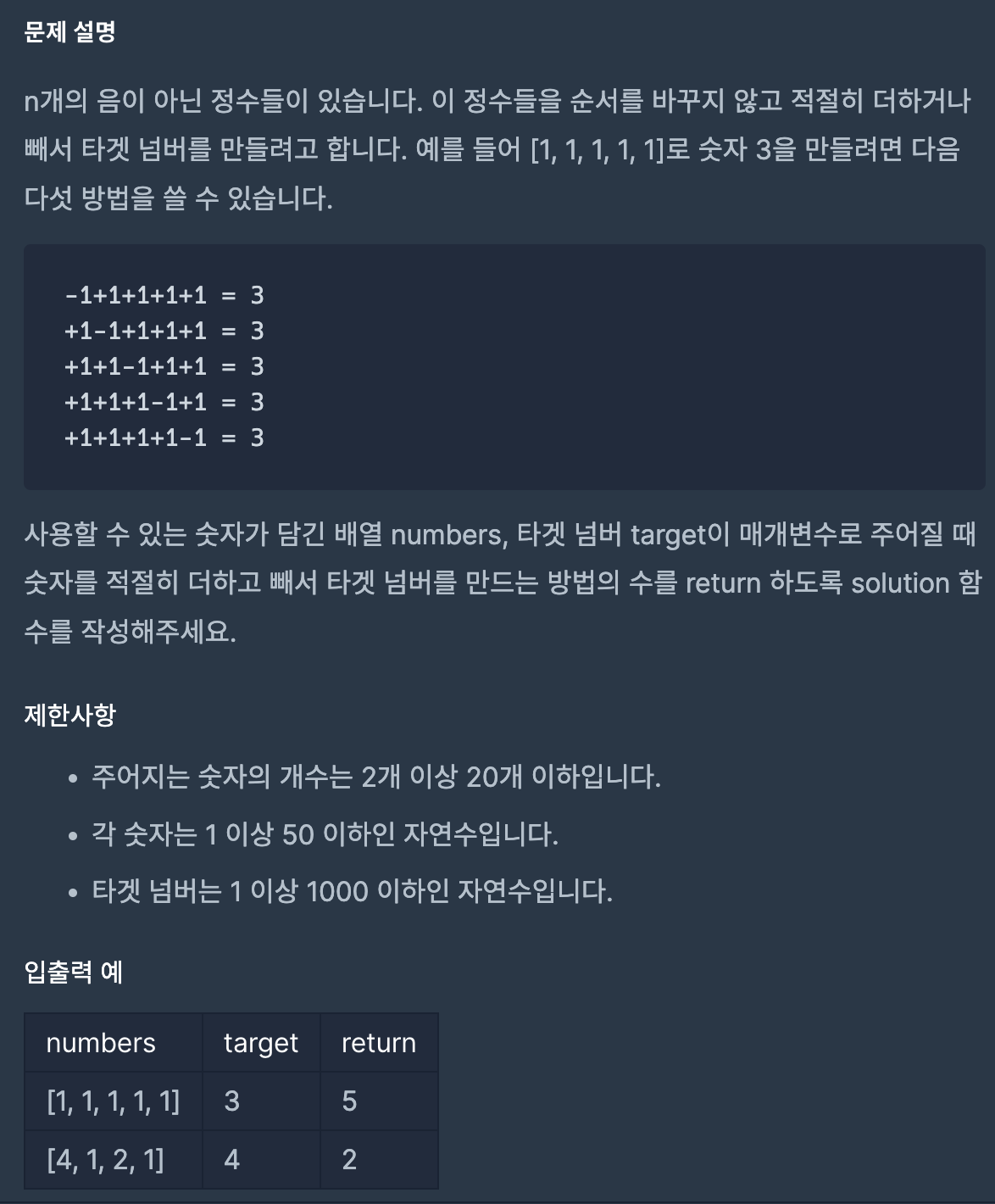 문제출처 : https://school.programmers.co.kr/learn/courses/30/lessons/43165 (프로그래머스 - 코딩테스트 연습(타겟 넘버))