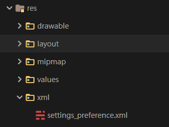 사진과 같이 res에 xml 디렉토리를 하나 만들어서 settings_preference.xml을 만들어 원하는 기능을 추가한다.