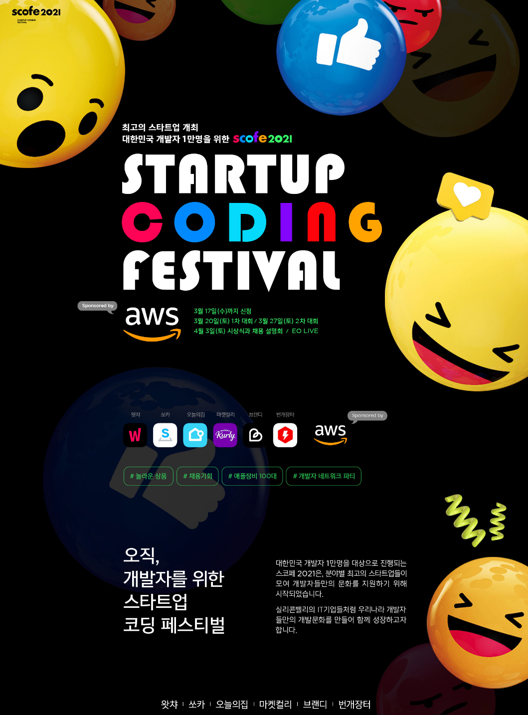 최고의 스타트업 개최 대한민국 개발자 1만명을 위한 scofe2021 ~3/17(수)까지 신청 접수! 대한민국 개발자 1만명을 대상으로 진행되는 스코페2021은, 분야별 최고의 스타트업들이 모여 개발자들만의