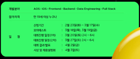 개발분야와 참가자격, 일정등도 상세하게 나와 있다. 다만 의아한 점은 개발 분야에 따라 다른 대회가 진행되는지에 대한 의문점이다. AOS면 AOS에 관련된, IOS면 IOS에 관한 문제가 다 따로 나오긴 어렵기에 알고리즘 문제가 나오지 않을까 하는 생각이 든다. 학부시절 열심히 하던 알고리즘 문제를 다시 열심히 해봐야겠다. 다 까먹었는데 망했다...... 어찌됐든 저찌됐든 여튼저튼 많은 사람들이 참여해서 좋은 문화로 자리 잡으면 좋겠다.